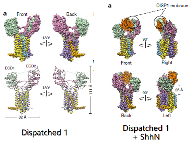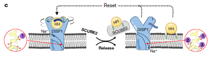 研究揭示了Dispatched膜蛋白通過(guò)與Na+離子結(jié)合為釋放Hedgehog信號(hào)蛋白提供動(dòng)力的機(jī)制。論文解析了小鼠Dispatched同源結(jié)構(gòu)域(DISP1)的冷凍電鏡結(jié)構(gòu),它是一個(gè)跨膜12次的膜蛋白,能將脂質(zhì)修飾的Hedgehog信號(hào)蛋白(HH)從細(xì)胞膜上釋放出來(lái),恢復(fù)其長(zhǎng)距離信號(hào)傳導(dǎo)的作用。論文闡明了Dispatched蛋白的作用機(jī)制,它的跨膜部分離子通道內(nèi)有3個(gè)天冬氨酸,可以結(jié)合3個(gè)Na+離子。結(jié)合1個(gè)Na+離子時(shí),Dispatched與HH的N端信號(hào)傳導(dǎo)域(ShhN)結(jié)合;結(jié)合3個(gè)Na+離子時(shí),Dispatched釋放ShhN。這一發(fā)現(xiàn)表明跨膜Na+通量可為從膜中提取Hedgehog信號(hào)蛋白提供動(dòng)力。