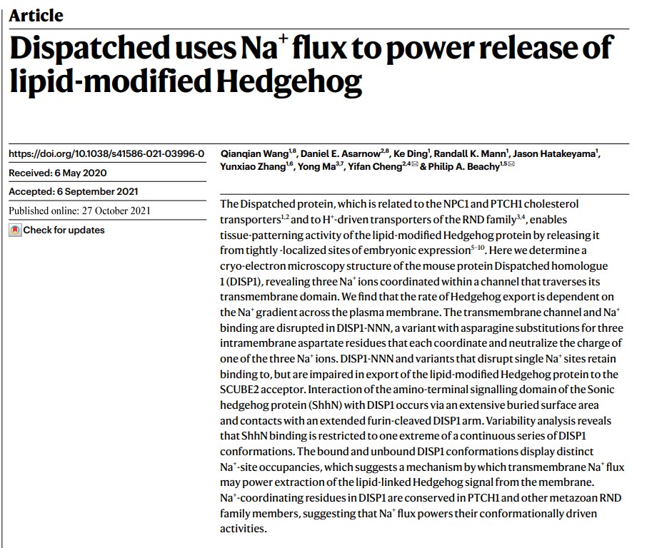 近日,蘇州唯善生物科技有限公司科學(xué)顧問(wèn)馬勇教授參與的《Dispatched uses Na+ flux to power release of lipid-modified Hedgehog》研究發(fā)表在國(guó)際知名期刊《Nature》上。